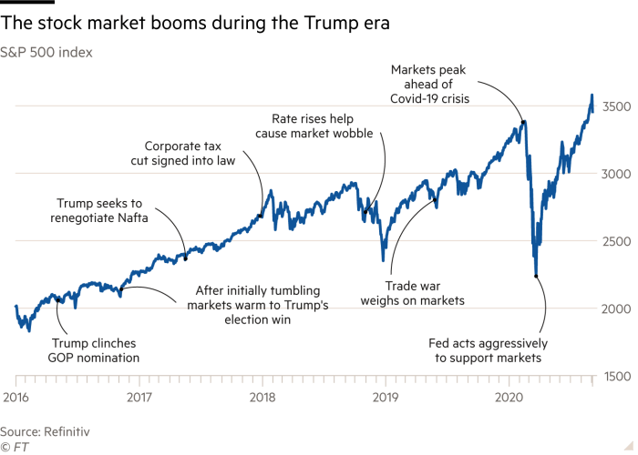 Above I have borrowed a brilliant image from the FT that shows the effect Trump has had on the S&P 500 throughout his presidency and some of the key moments along the way. As we can see there has clearly been a meteoric rise. Trump’s determination to keep the stock market growing throughout his presidential term is evident. A combination of the relentless pressure that he has put on Jerome Powell and the Fed to keep interest rates low and his own determination to keep taxes low has seen markets react in an extremely bullish way over the last 4 years. Even with the crisis of the global pandemic we can see that both Trump and the Fed have acted aggressively to support markets with the S&P 500 actually passing its pre-pandemic highs. Therefore, one could make a very strong case that this may well happen again if he is to be re-elected.